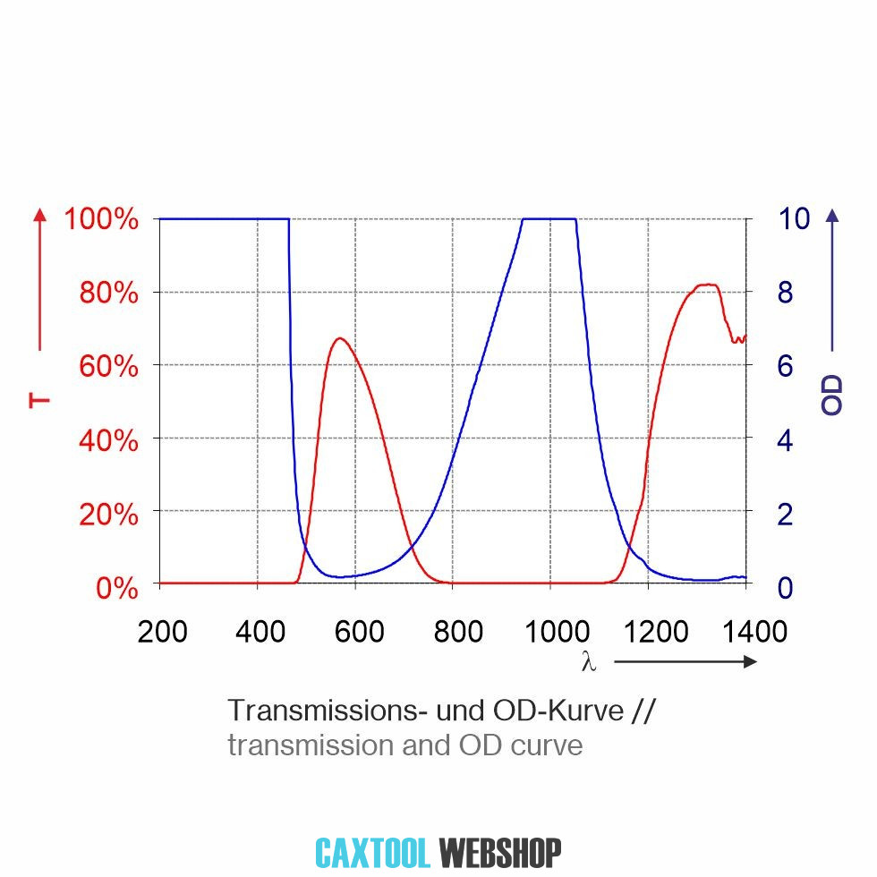 The laservision laser safety window 000.P1P21.2001 (with a thickness of approx. 3-3.2mm) is a gold-colored laser protection window with a scratch-resistant coating. Due to the high ODs in the UV and blue range (OD10+ at 180 – 315 nm; OD8+ >315-464nm), the broad and high protection level within the NIR (OD5+ at 815nm; OD8+ at 880nm, OD10+ at 940-1055nm) and in the infrared (OD8 + at 5230 - 14570 nm), the window is suitable for blue high power diodes as well as for disk, Nd: YAG, fiber or with CO2 lasers. The gold-colored laser safety window is 200x100mm in size and has good color vision and VLT of appr. 47%. It is customer-specific available up to a standard size of 1219x915mm. The maximum size can be 2000 x 1150mm. The thickness is about 3mm.