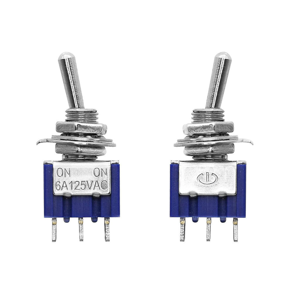 DPDT, 6 Pin terminals, ON/OFF/ON 3 Position Toggle Switch.Can be used on low voltage or high voltage circuits ideal for switching lights or motors. Each switch comes with two hex nuts, a flat and a locking washer.