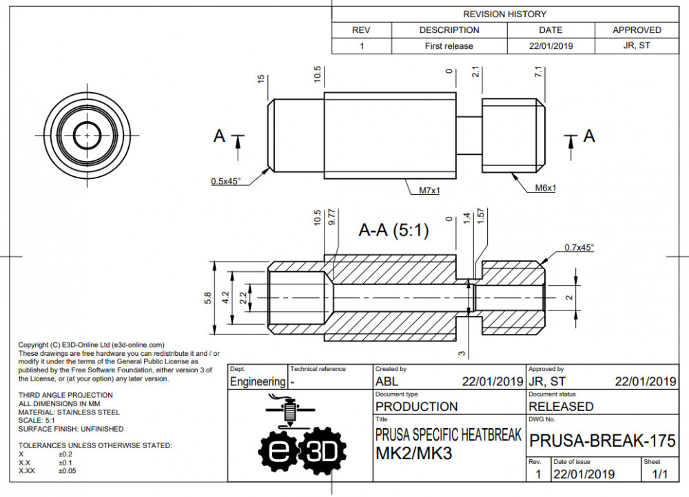 Prusa V6 heatbreak 1.75 mm (MK2, MK3) originálny E3D