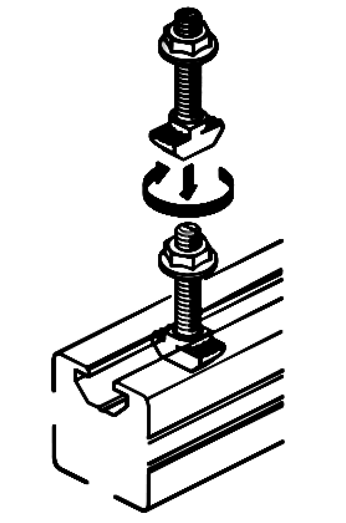 The head width of the hammer-head screw is designed so that it can be inserted into the profile slot from above; to ensure a secure hold, the hammer head must be rotated 90° within the profile slot. The collar beneath the hammer head is designed to prevent the hammer head screws from being over-tightened. Can be built with all profiles of the series B8.