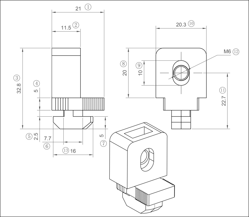 The Variofix block is used to fasten various surface elements. The Variofix block can be inserted into the profile groove at any point and is fixed securely in the groove by turning it 90°. Inside the component is a square steel nut into which a screw with an M6 thread can be screwed