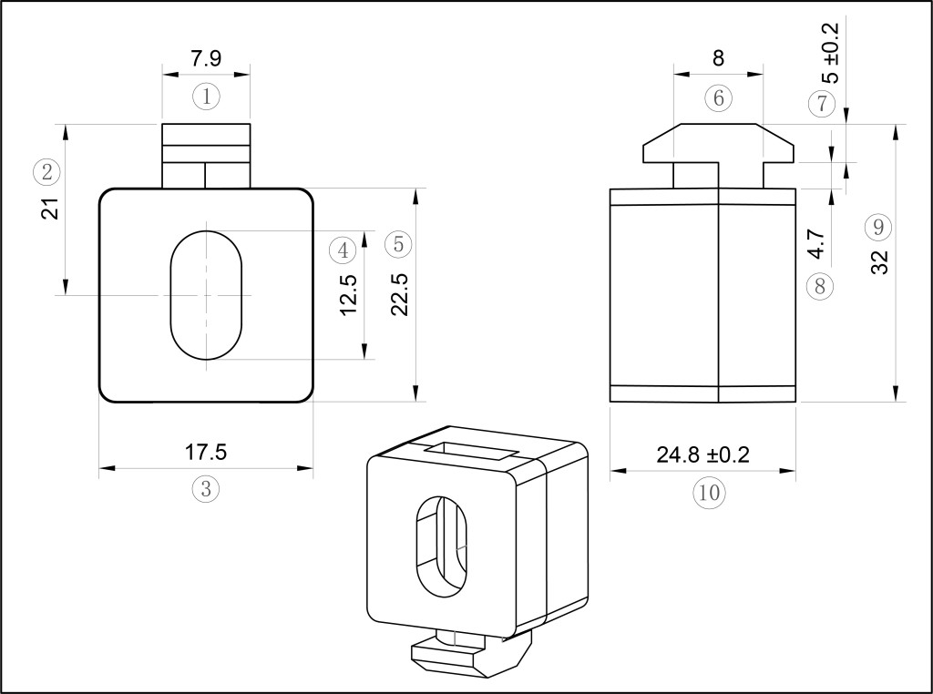 The Multiblock is used to fasten various surface elements. The Multiblock can be inserted into the profile groove at any point and is fixed securely in the groove by turning it 90°. Inside the component is a square steel nut into which a screw with an M6 thread can be screwed