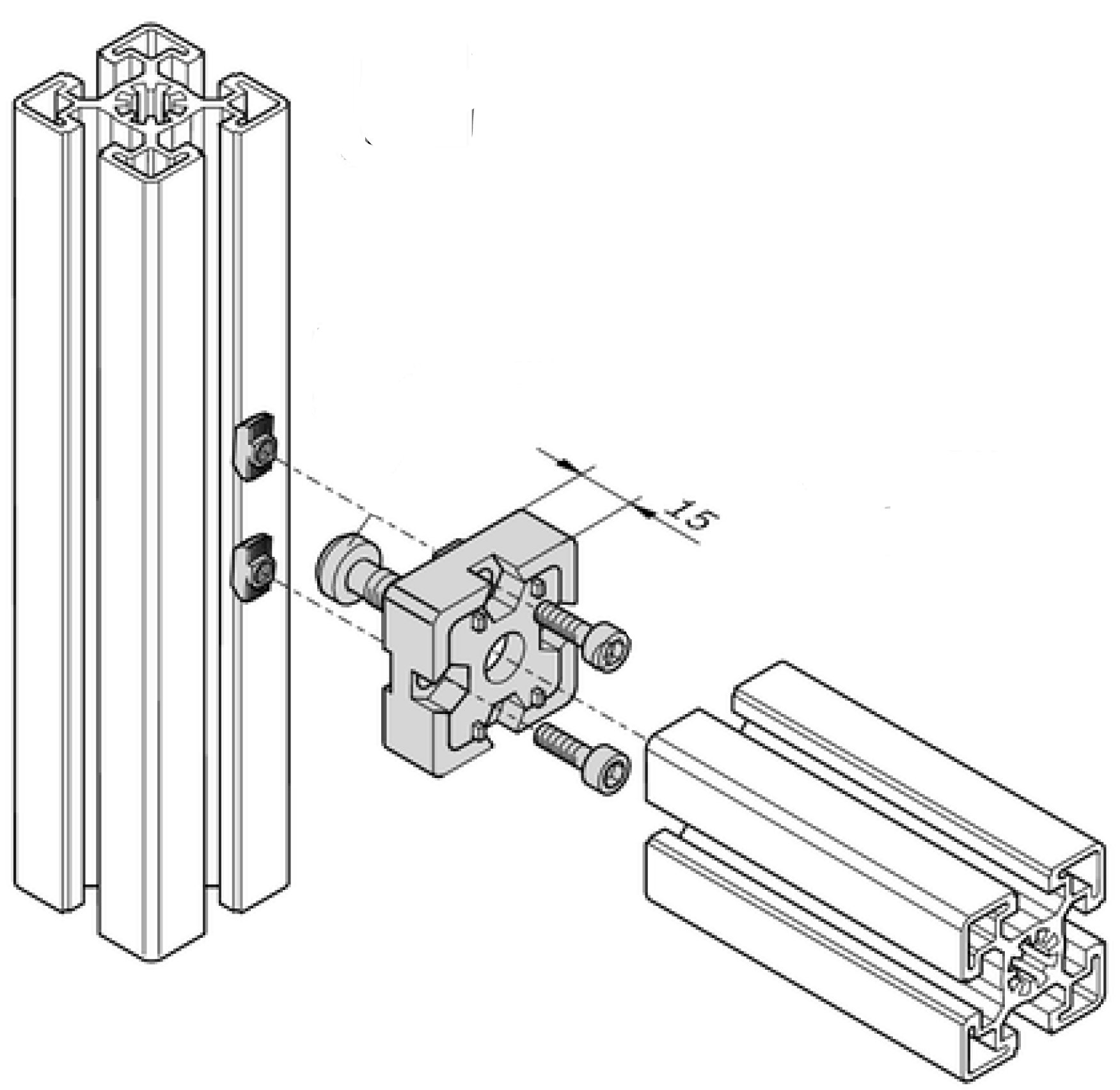 These T-connector plates are used for a stable 90° connection with small machining effort. One M12 thread must be cut into the core bore of one profile and fix the plate to the profile. Put the T-nuts in the other profile and connect the plate fixed to profile on the right place with screws. Can be built with profile of the series 10 40x40.